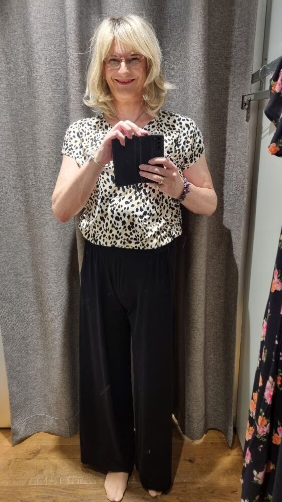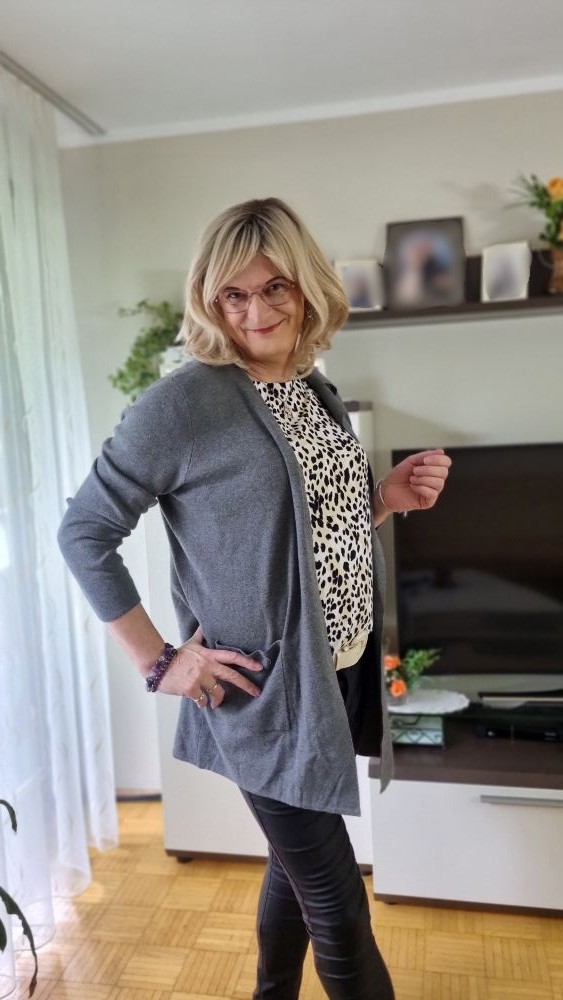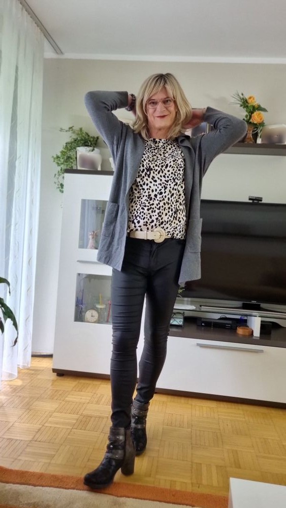 Dann folgte der Outfitwechsel: Kunstlederhose, Leo-Shirt, Hoodie-Strickjacke – eine Kombination, die für mich genau die richtige Balance zwischen alltagstauglich und feminin findet. Der Gürtel setzt einen dezenten Akzent in der Taille, das Leo-Muster bringt Leben ins Outfit, und die Strickjacke sorgt für den gemütlichen Touch. Abgerundet habe ich den Look mit meinen dunkelbraunen Stiefeletten, die nicht nur bequem sind, sondern auch diesen kleinen Schuss Eleganz mitbringen. So startete ich in den Tag: praktisch, bequem, aber mit genau dem Hauch Feminität, der mich den ganzen Tag begleiten würde.