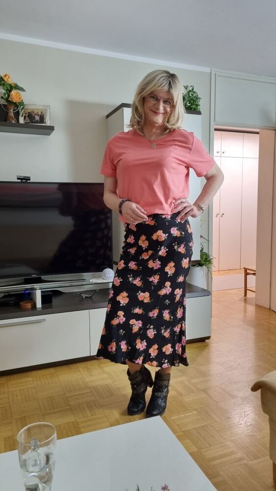 Schon nach wenigen Minuten hing die erste Entdeckung über meinem Arm: eine schwarze Hose aus Feinstrick, gerade geschnitten, mit etwas weiterem Bein. Elegant, bequem, vielseitig kombinierbar – ein Volltreffer. Kurz darauf fiel mir ein Rock ins Auge: schmal geschnitten, geblümter Stoff, am Saum ein edler Abschluss aus Seidenspitze. Genau die Art Teil, die schon im Laden Bilder im Kopf auslöst: dazu ein leichtes Oberteil, vielleicht Sandalen im Sommer, oder Pumps und Strumpfhose im Herbst.