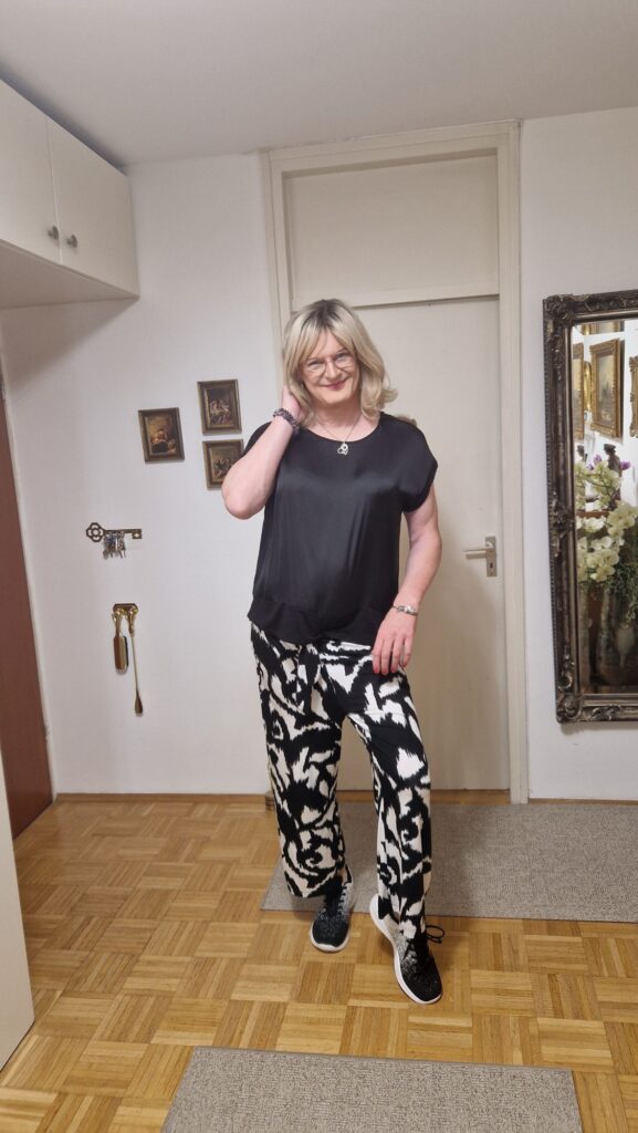 Das Outfit stand schon fest: eine schwarz-weiße, leichte Baumwollhose mit weitem Bein, dazu ein schwarzes, leicht glänzendes Shirt. Schlicht, aber mit Ausstrahlung. Die Stoffe fühlten sich weich an, der Look war klar, elegant und unaufgeregt. Passend dazu trug ich meine schwarz-weißen Sneaker – feminin, aber bequem genug für einen ganzen Tag auf den Beinen. Für alle Fälle musste noch der graue Cardigan mit. Das Wetter versprach Sonne, doch am See kann es schnell frisch werden. Ein kurzer Blick in den Spiegel, Schmuck anlegen, ein stilles Lächeln, und ich war bereit für den Tag.