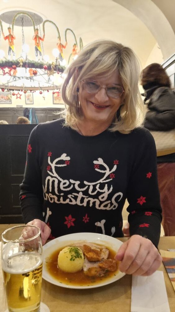 Nach der Glühweinpause ging es weiter ins Restaurant. Auch dort: voll. Kurz vor Weihnachten, Innenstadt, Nähe zum Christkindlmarkt. Nach vielleicht 15 Minuten Wartezeit bekamen wir einen Platz an einem Tisch, an dem bereits zwei Touristen saßen. Alles lief ganz selbstverständlich ab. Ich bestellte einen kleinen Schweinebraten mit Knödeln und dazu ein Radler. Und irgendwann kam dieser ganz alltägliche Moment, der für mich dennoch immer wieder eine besondere Bedeutung hat. Also Handtasche geschnappt und ins Untergeschoss. Natürlich zur Damentoilette. Ich stellte mich in die kurze Schlange, vier oder fünf Damen vor mir. Kein zweiter Blick, kein Stirnrunzeln, kein Fragezeichen. Alles ruhig, selbstverständlich, normal. Genau so, wie es sein sollte.