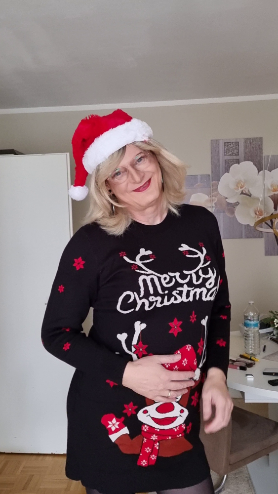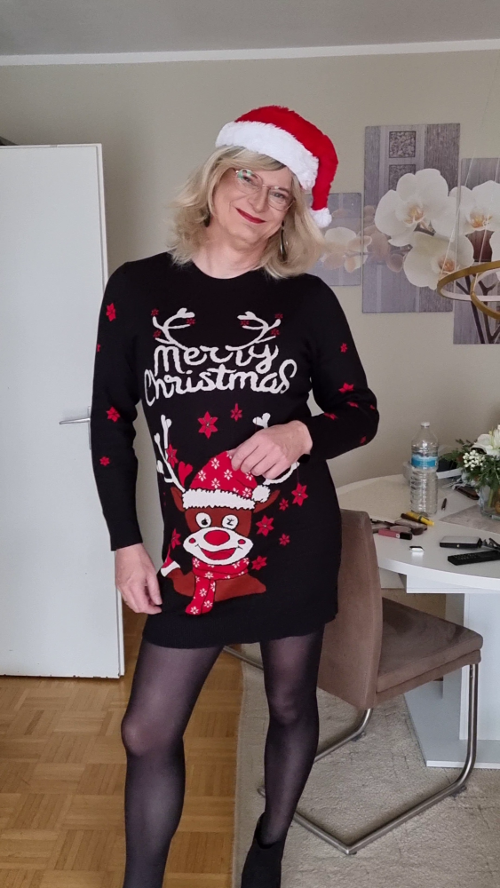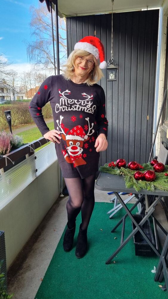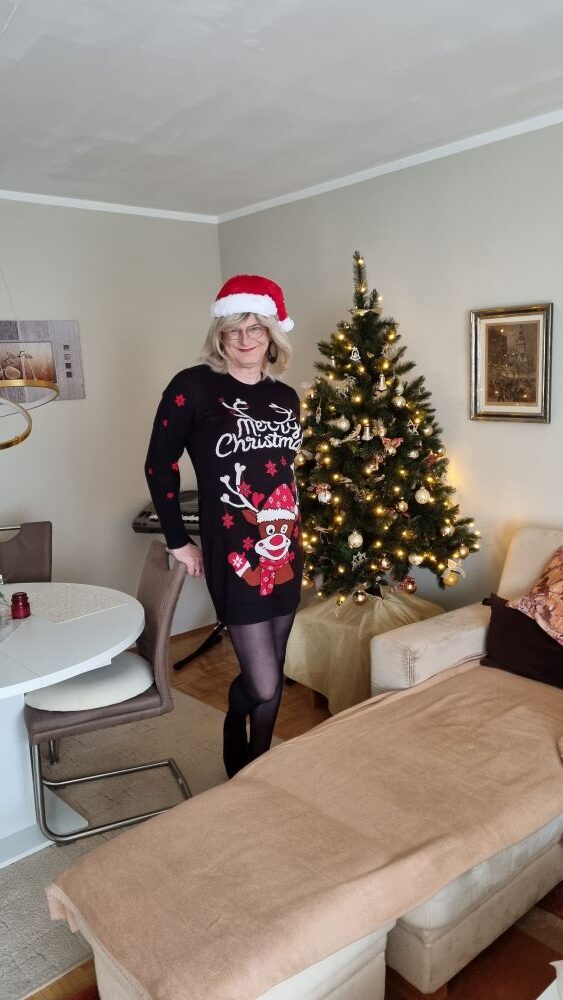Danach entstanden zuhause noch einige Fotos. Mein neues „Merry Christmas“-Strickkleid wollte festgehalten werden. Schließlich ist es Weihnachten. Ich probierte verschiedene Strumpfhosen aus, helle, glänzende, schwarze. Die schwarze war schnell der Favorit, aber auch die helle hatte ihren Reiz. Wohnzimmer, Flur, Balkon, vor dem Weihnachtsbaum. Mal mit roter Zipfelmütze, mal ohne. Nicht gestellt, nicht perfekt, sondern einfach schöne, stimmige Bilder. Und natürlich auch ganz pragmatisch gedacht: Man braucht ja ein paar Bilder für die sozialen Netzwerke. Aber vor allem mochte ich mich selbst auf diesen Fotos.